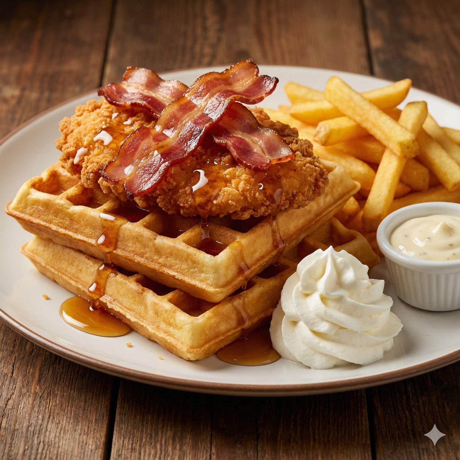 Crispy fried chicken (Breast fillet) with salty bacon over 2 crispy & sweet waffles with maple syrup and whipped Cream along a side of chips & garlic aioli!