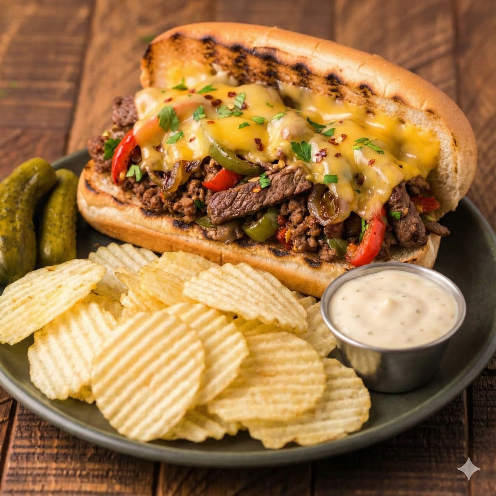 Hot & spicy beef filling (Mince + Steak strips) with peppers, caramelised onion with american cheese inside a soft classic american hot-dog toasted on an open grill along with a side of chips & garlic aioli